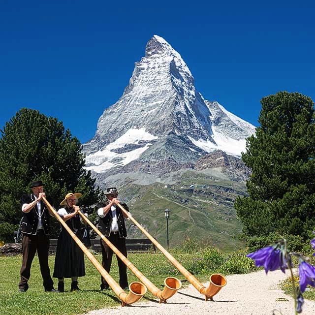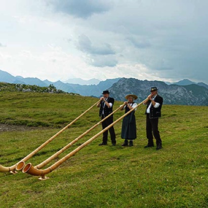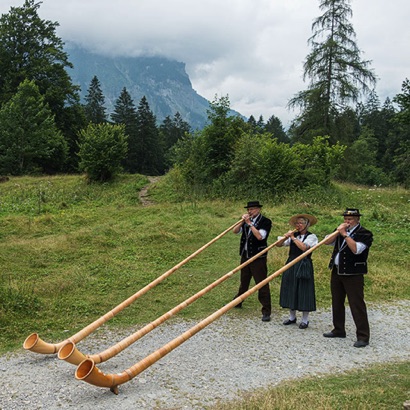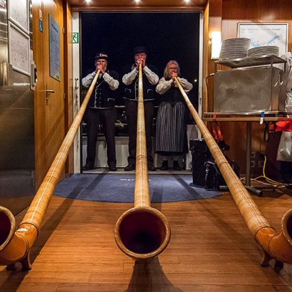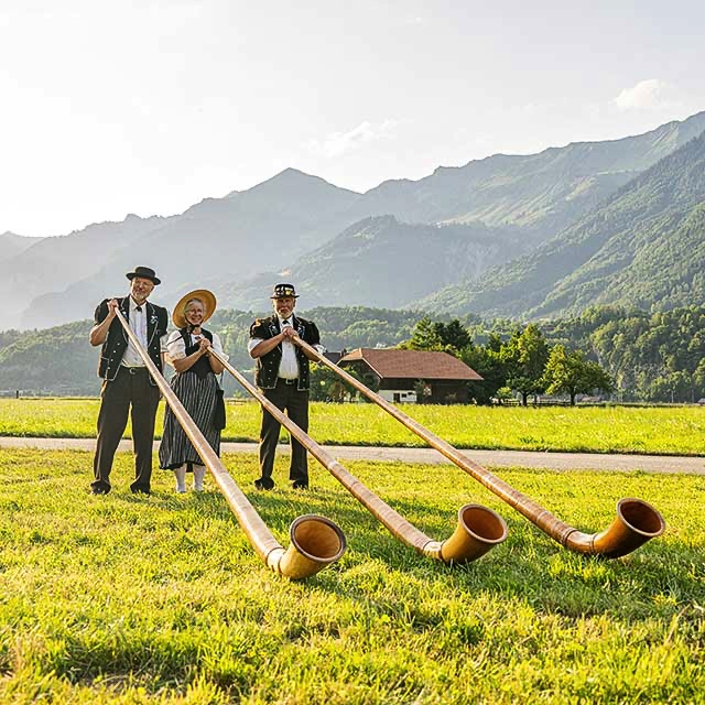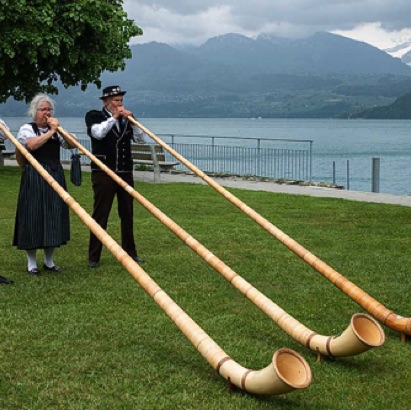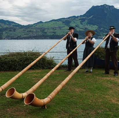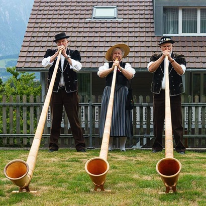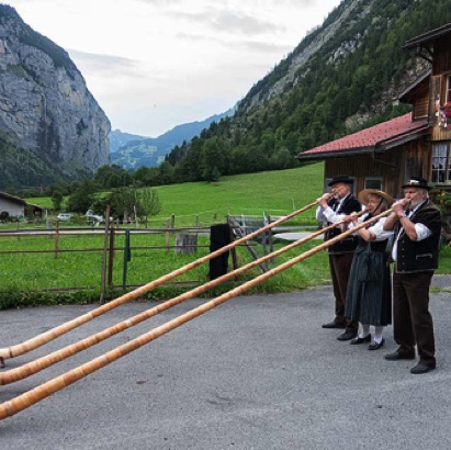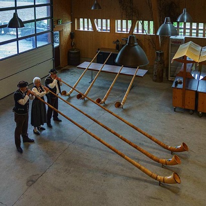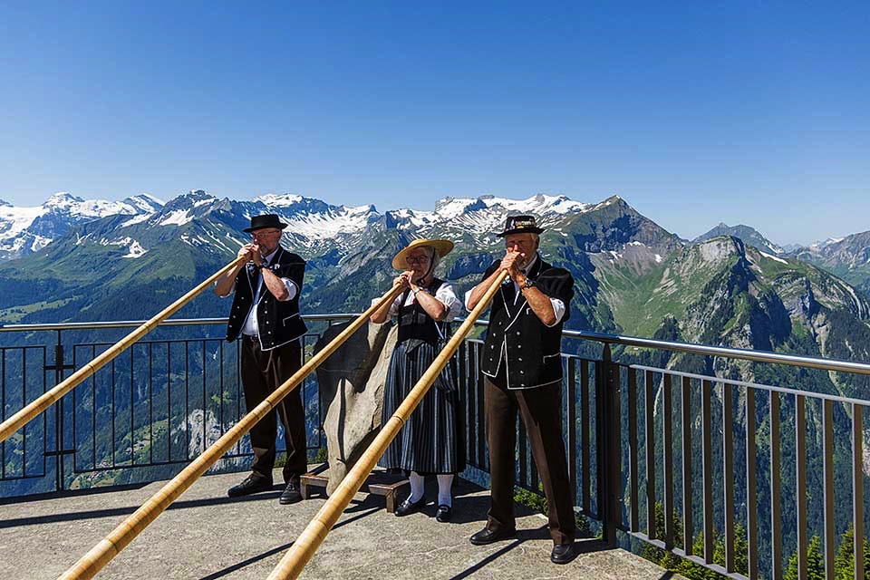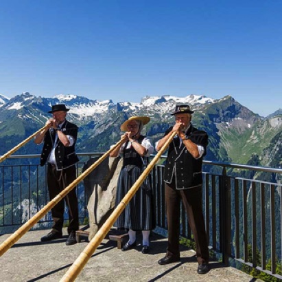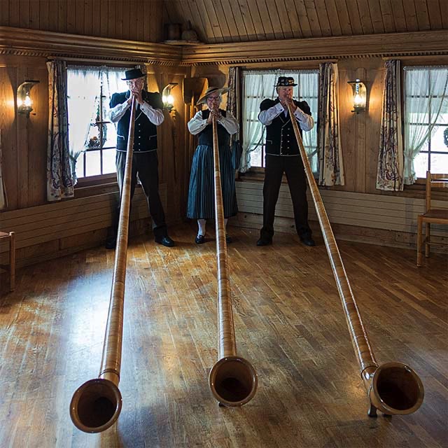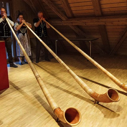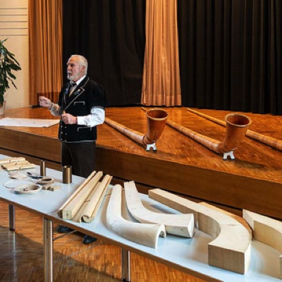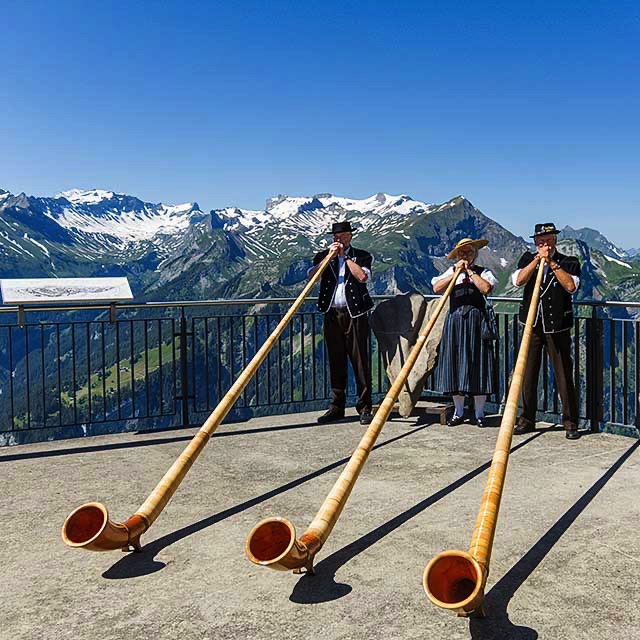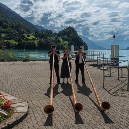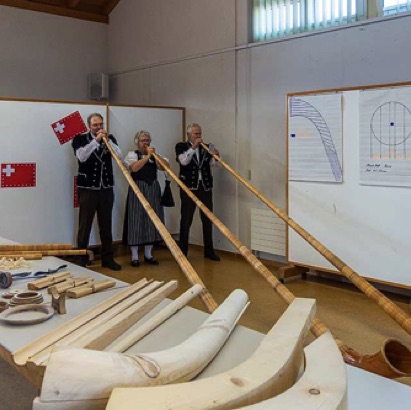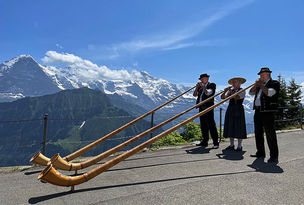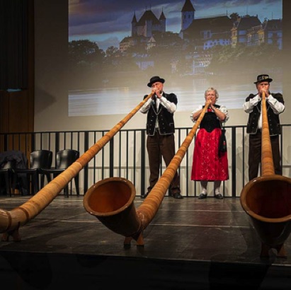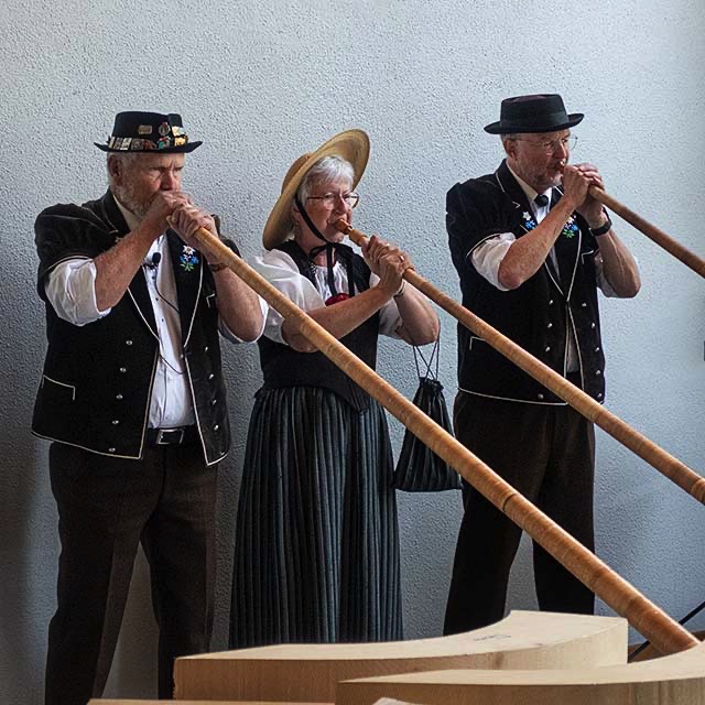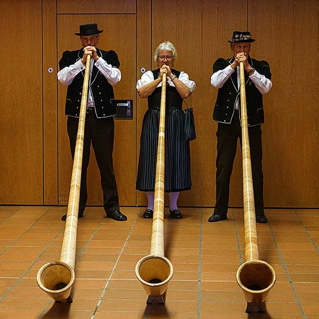 2026-03-18_Interlaken das Alphorntrio Silberhorn spielt vor dem Abendessen der ESA-Konferenzbesucher aus 30 Nationen traditionelle Alphornmelodien.