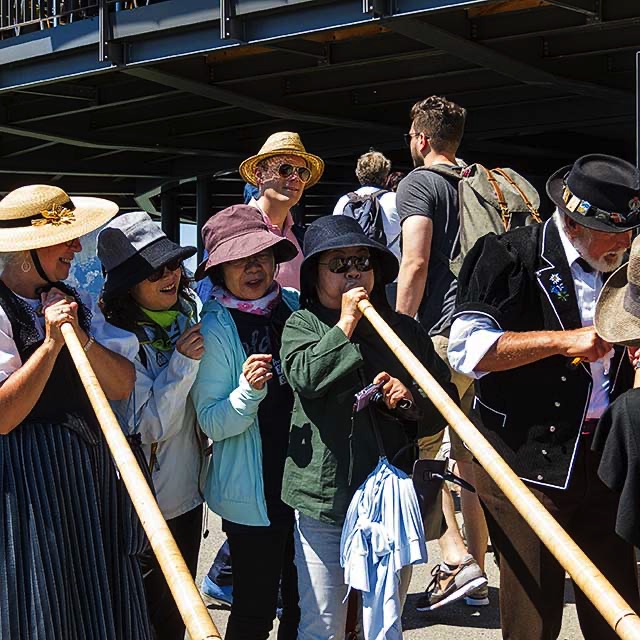2023-10-20_Gurten viele Anwesende versuchen einem Alphorn einen Ton zu entlocken - zur grossen Erheiterung der Zuhörer.