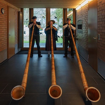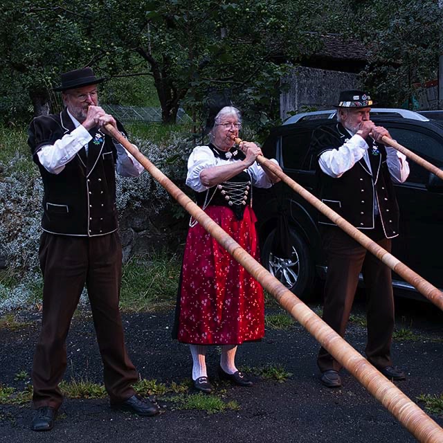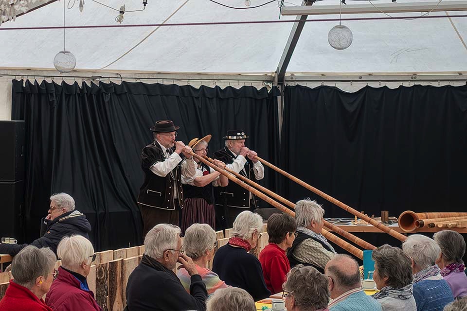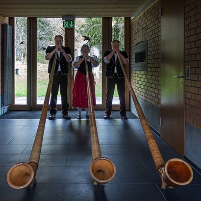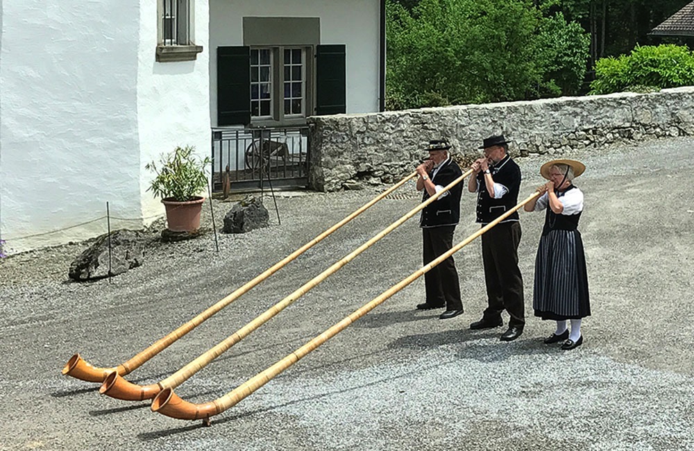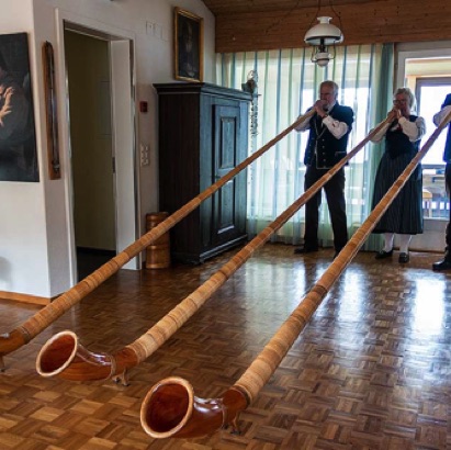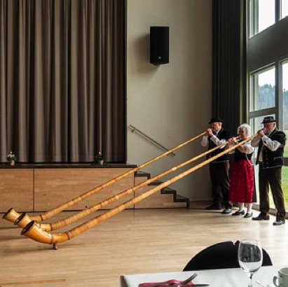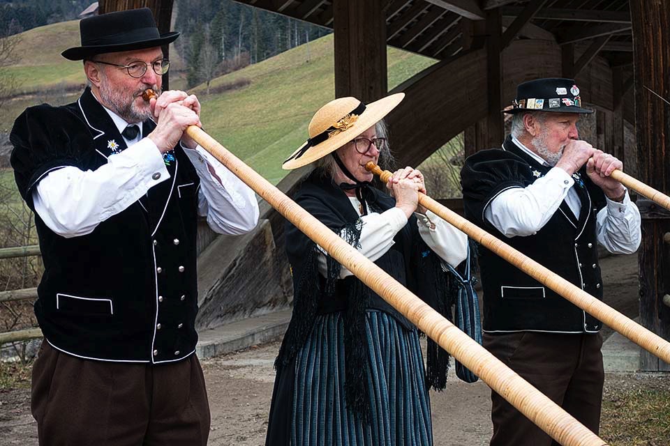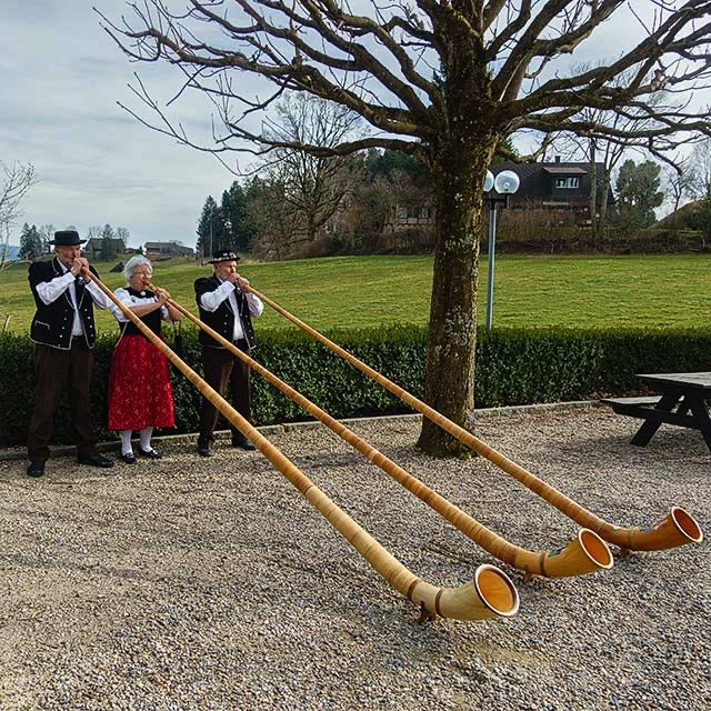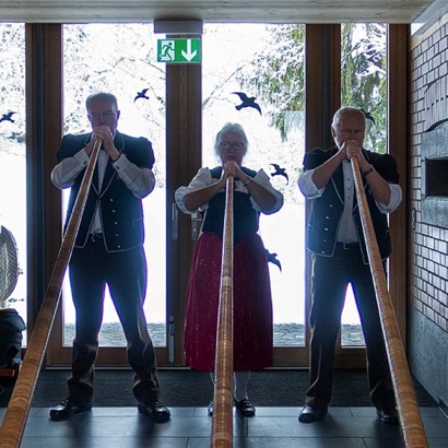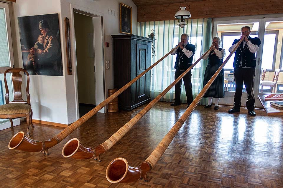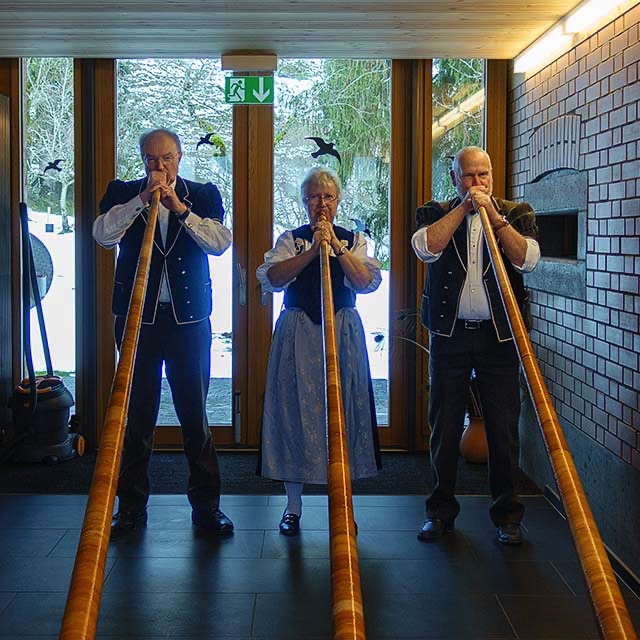 2024-04-27_Rüschegg das Alphorntrio Silberhorn begrüsst die Gäste der Geburtstagsparty mit einer Alphornmelodie.