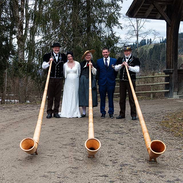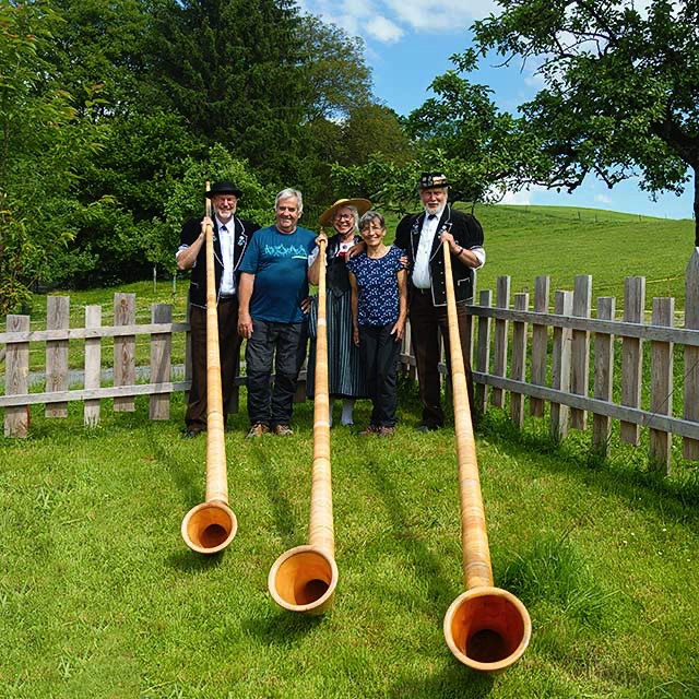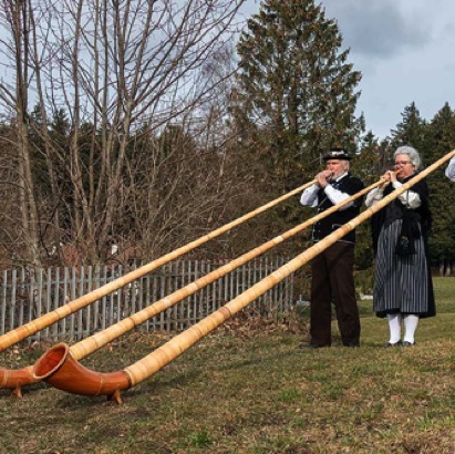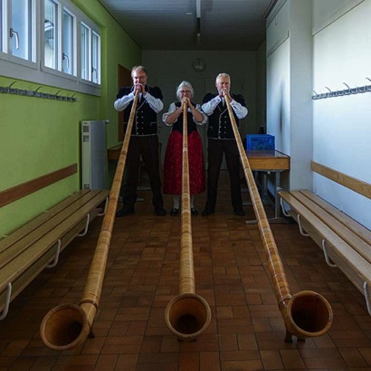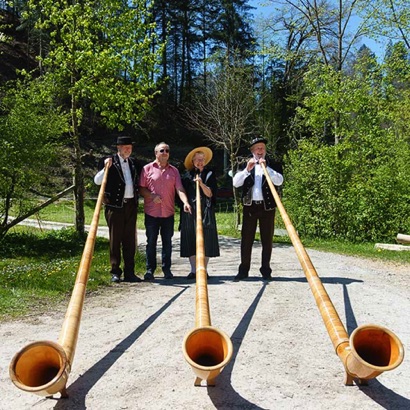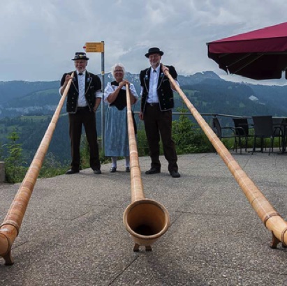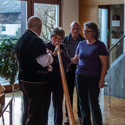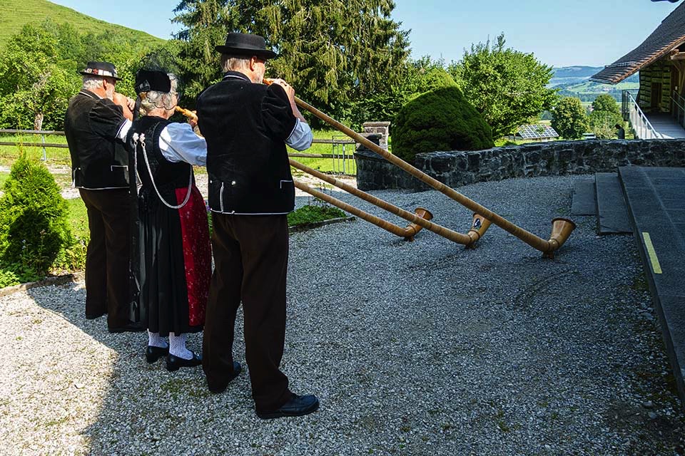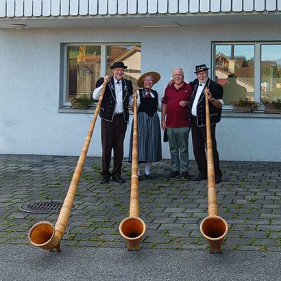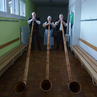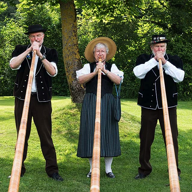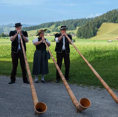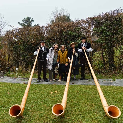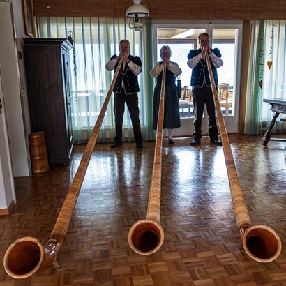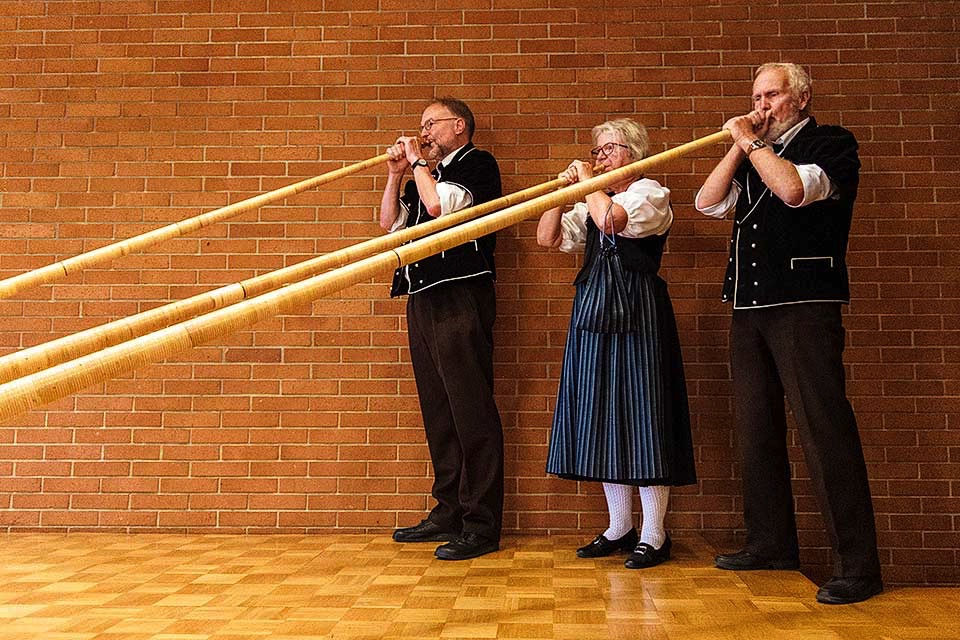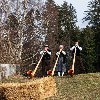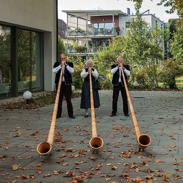 2024-04-27_Rüschegg das Alphorntrio Silberhorn begrüsst die Gäste der Geburtstagsparty mit einer Alphornmelodie.