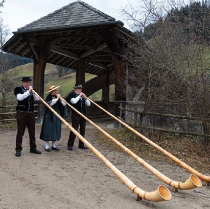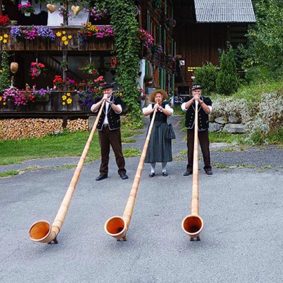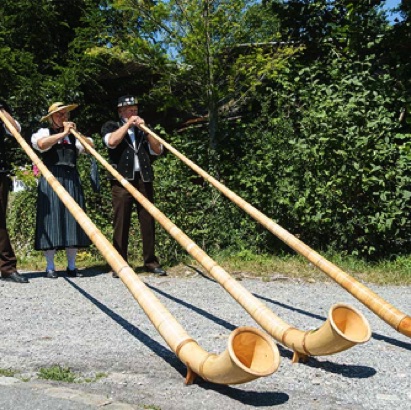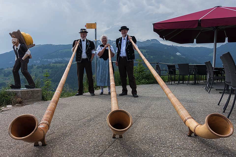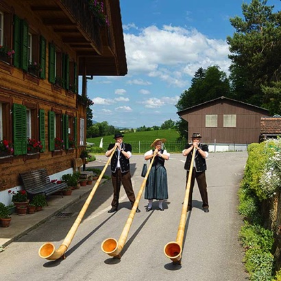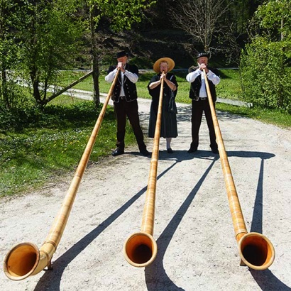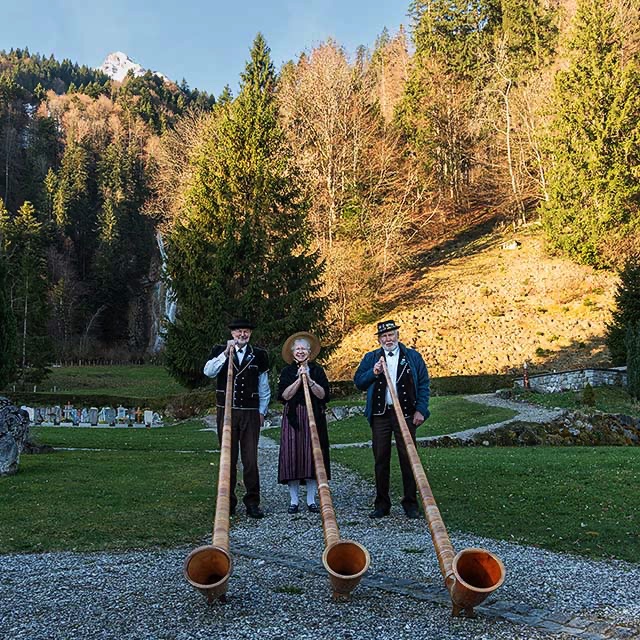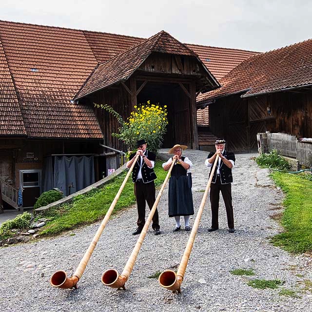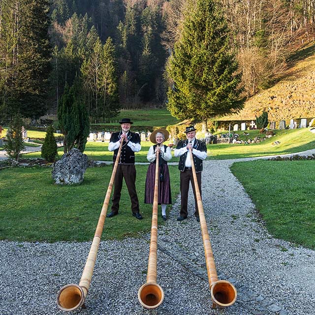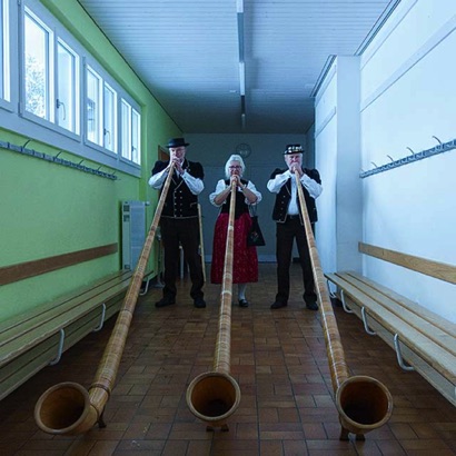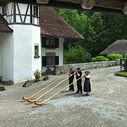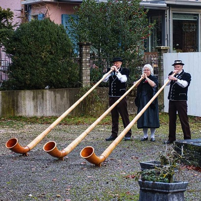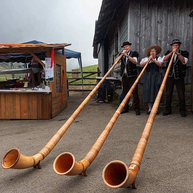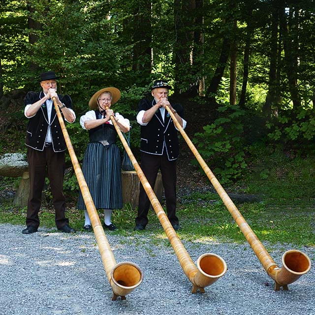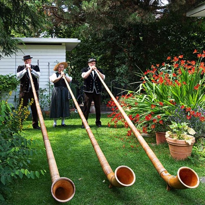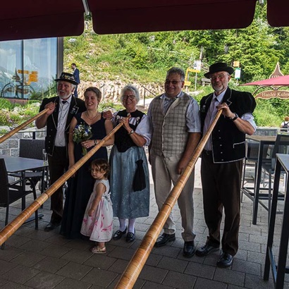 2024-04-27_Rüschegg das Alphorntrio Silberhorn begrüsst die Gäste der Geburtstagsparty mit einer Alphornmelodie.