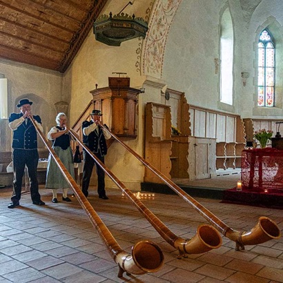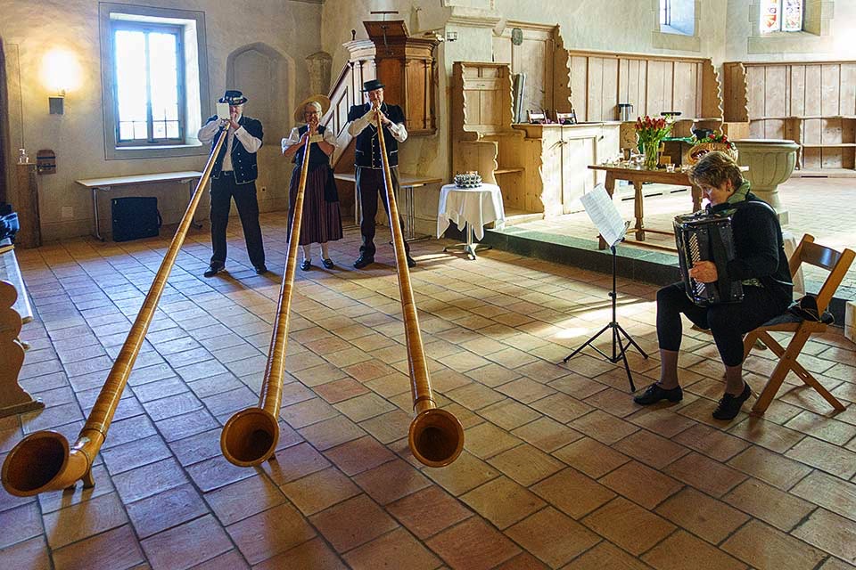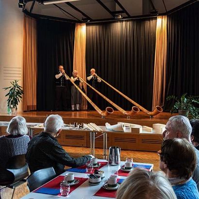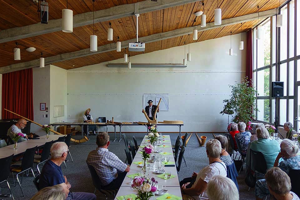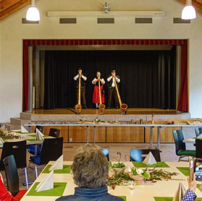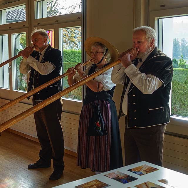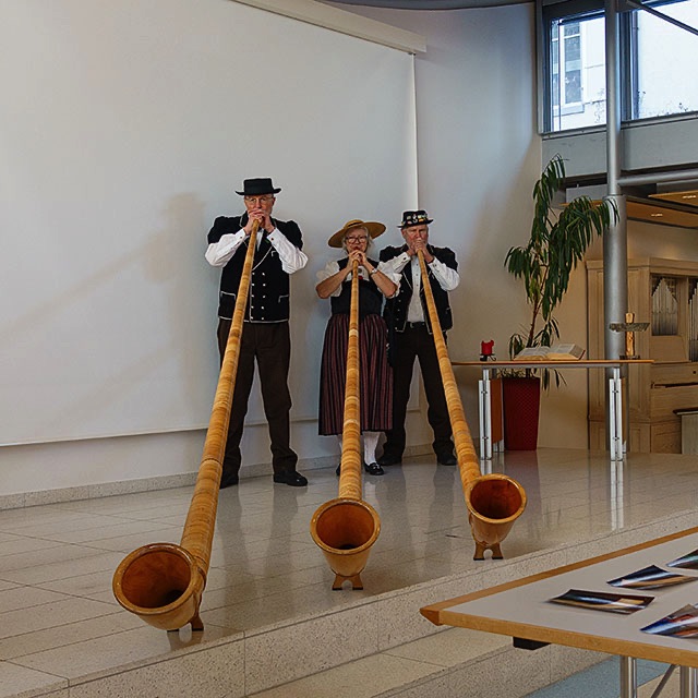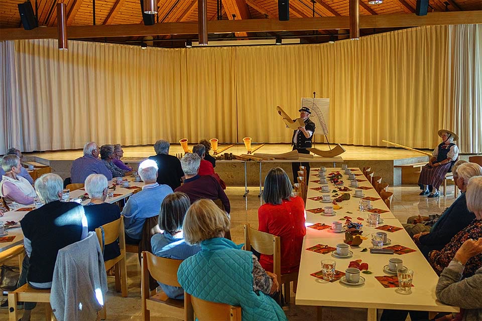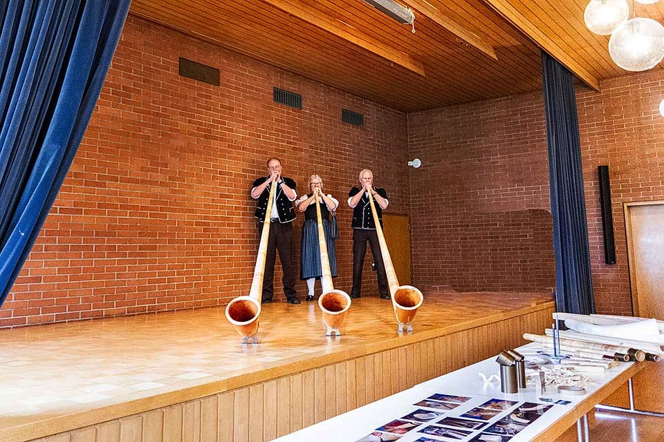 2022-10-10_Moosseedorf der Seniorennachmittag der Kirchgemeinde wird mit einer Alphornmelodie vom Alphorntrio Silberhorn eröffnet.