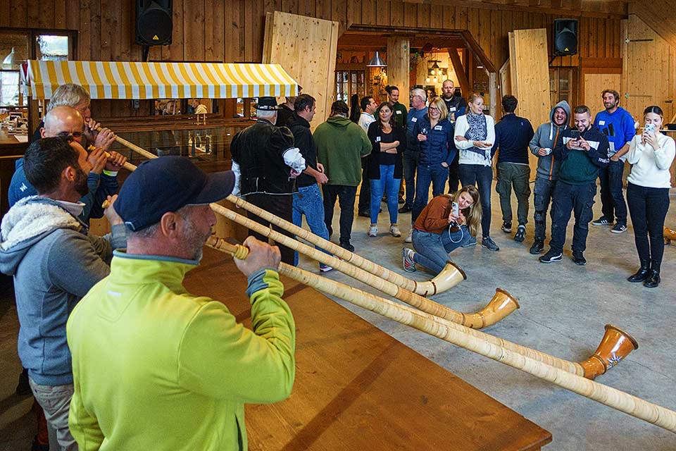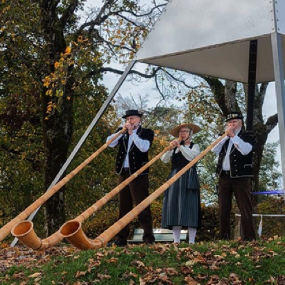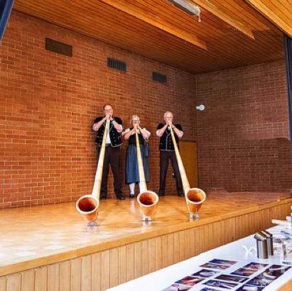 2023-10-20_Gurten das Alphorntrio Silberhorn begrüsst die Gäste eines Firmenanlasses mit einigen Alphornmelodien.