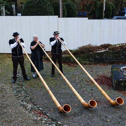 2023-12-10_Blumenstein das Alphorntrio Silberhorn empfängt die Gäste des Senioren-Weihnachtsessen mit Alphornmusik.