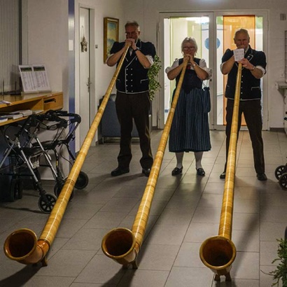 2020-09-23_Ins Alterszentrum das Alphorntrio Silberhorn spielt vor Beginn der Vorführung über Alphornbau