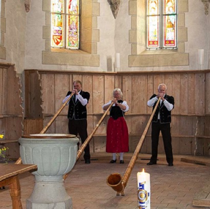 2022-04-17_Blumenstein zusammen mit Christine Gysler am Akkordeon gestaltet das Alphorntrio Silberhorn die musikalische Umrahmung des Ostergottesdienstes.