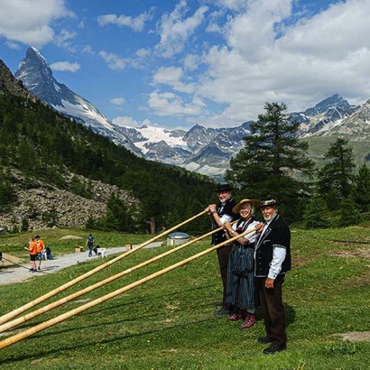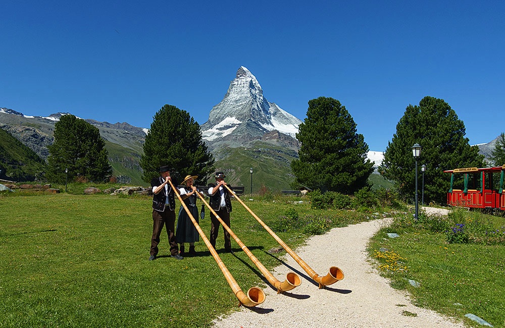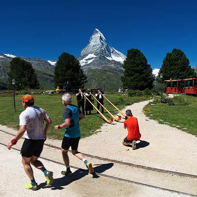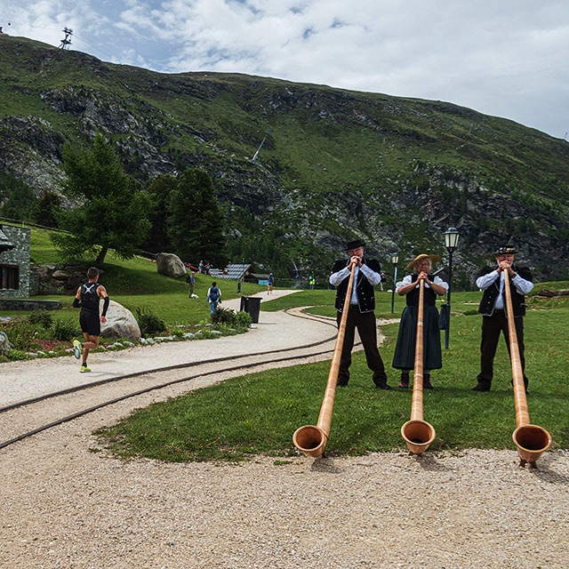 2021-07-03_Zermatt auf der Riffelalp begrüsst das Alphorntrio Silberhorn die Läufer des Gornergrat Zermatt Marathon mit seinen Melodien.
