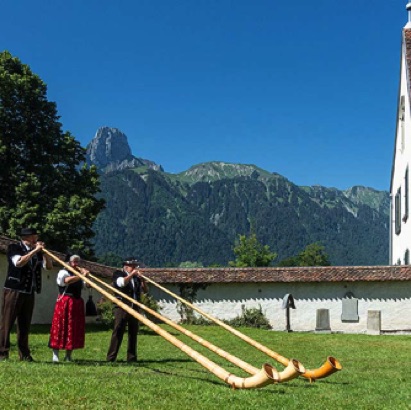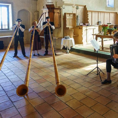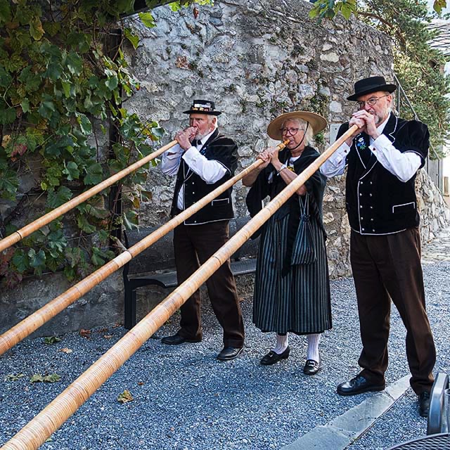 2021-10-02_Niedergesteln (VS) das Alphorntrio Silberhorn spielt für die Ritter des Ordens Pro Castillione auf.