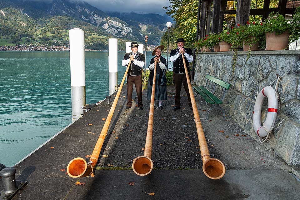 2021-10-13_Giessbach das Alphorntrio Silberhorn steht bereit für den Empfang der Reisegruppe die bald mit dem Schiff anlegt.