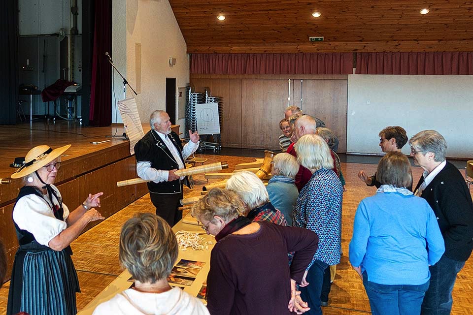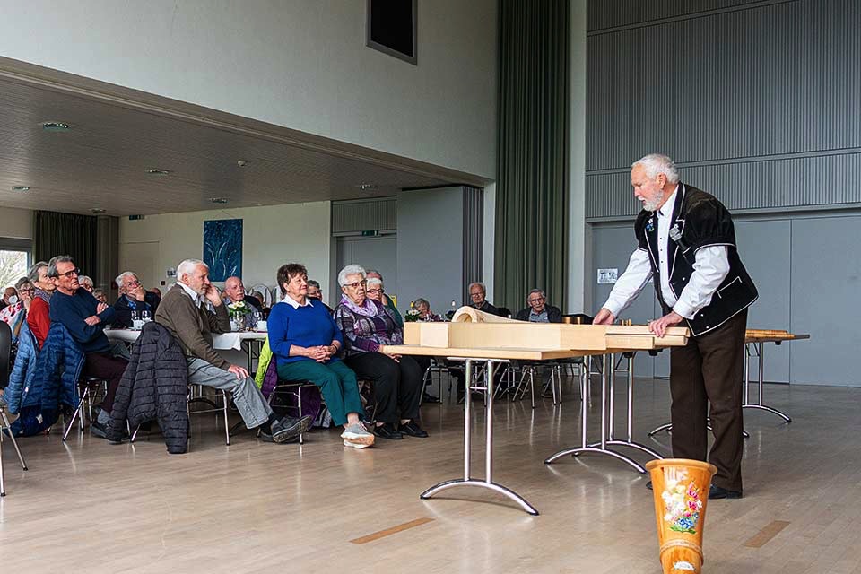2023-06-07_Niederscherli gespannt folgen die Senioren der Vorführung "So entsteht ein Alphorn" von Willy Glaus.