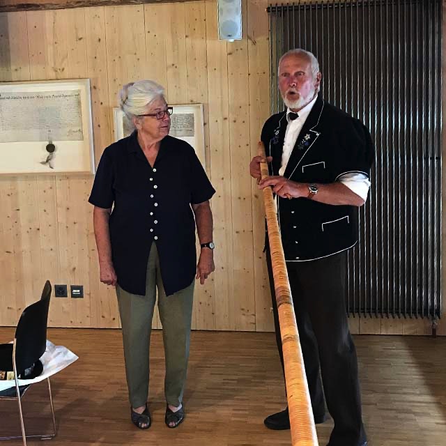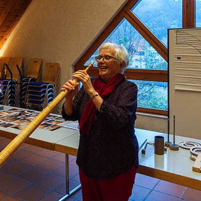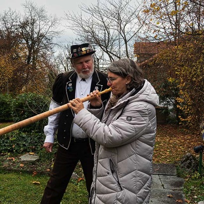 2021-11-21_Merligen die Jubilarin bläst unter der Anleitung von Willy Glaus eine kleine Melodie auf dem Alphorn.