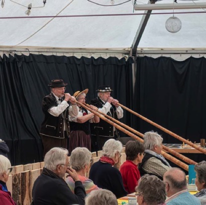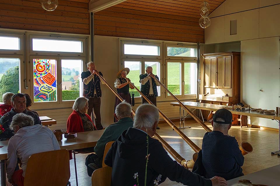 2023-10-17_Riggisberg zur Eröffnung des Seniorennachmittags spielt das Alphorntrio Silberhorn eine Alphornmelodie.