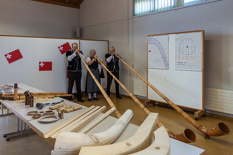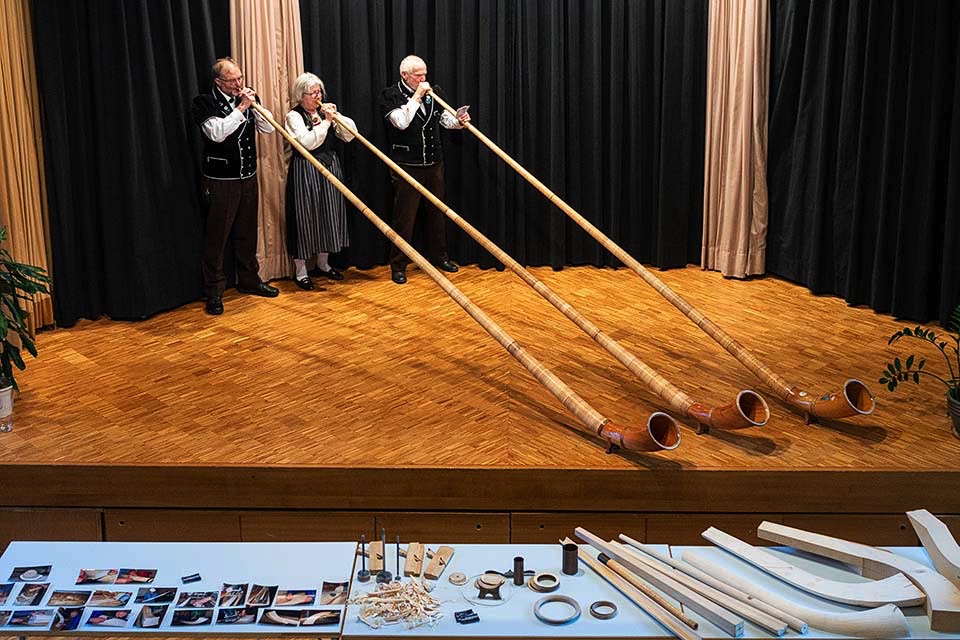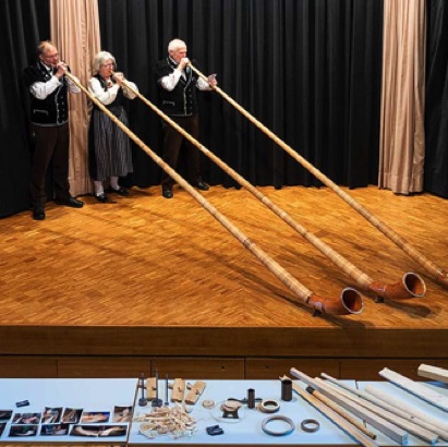 2023-10-17_Riggisberg nach der Vorführung "So entsteht ein Alphorn" bläst das Alphorntrio Silberhorn noch ein Alphornstück.