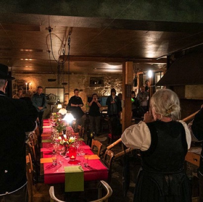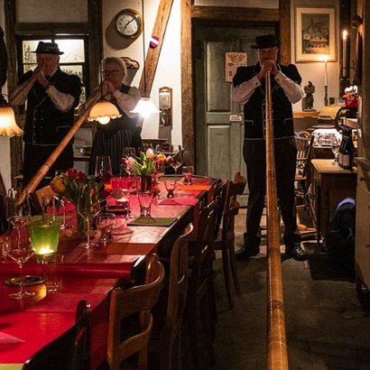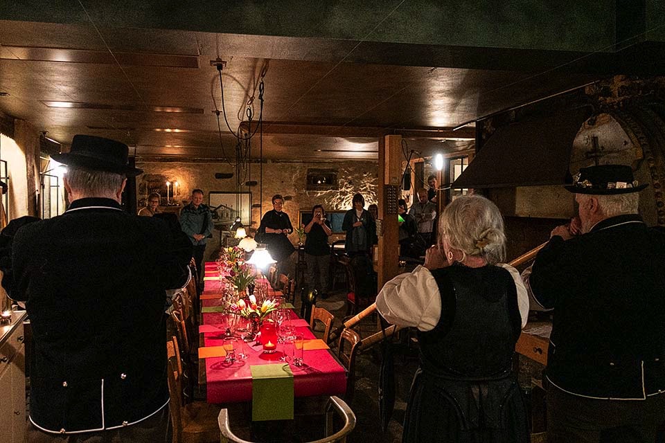 2021-10-30_Säriswil das Alphorntrio Silberhorn umrahmt den Apero einer Reisegruppe mit seinen Alphornmelodien im Restaurant Rössli.