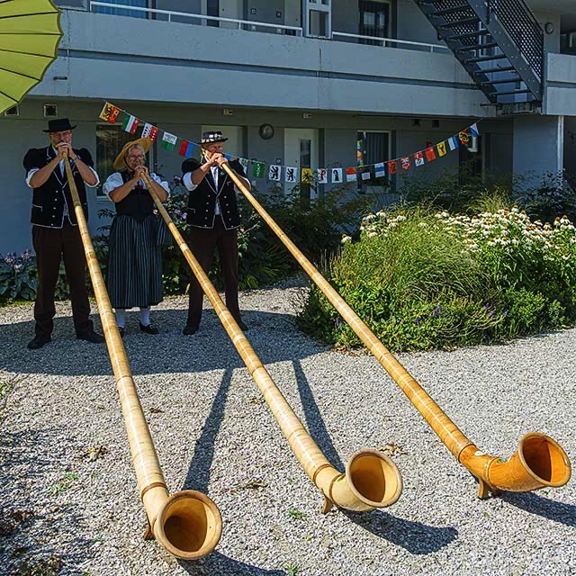 2024-08-01_Spiez das Alphorntrio Silberhorn begrüsst am Nationalfeiertag die Gäste des Hotel Belvedere zum Frühstück mit feierlichen Alphornmelodien.