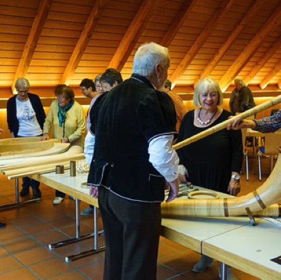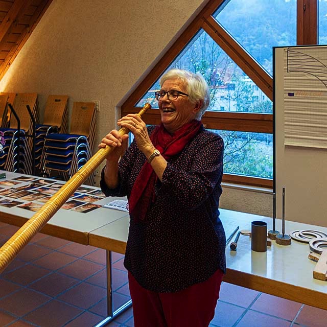 2019-10-29_Lausen Seniorentreff nach der Vorführung Alphornbau, darf versucht werden einen Ton zu entlocken. Die Freude ist gross, wenn es gelingt.