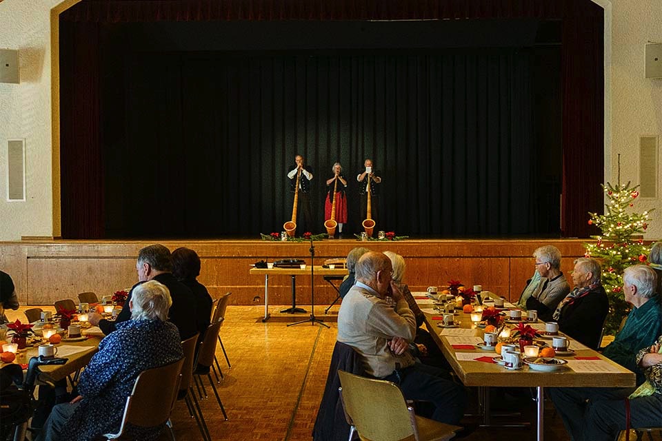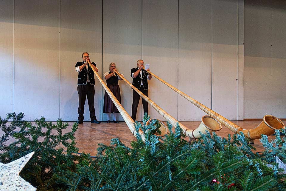 2023-12-05_Riggisberg das Alphorntrio Silberhorn trägt bei der Adventsfeier für die ältere Generation besinnliche Melodien vor.