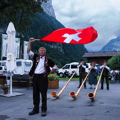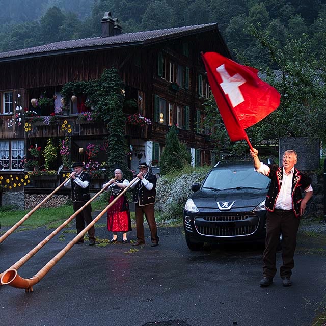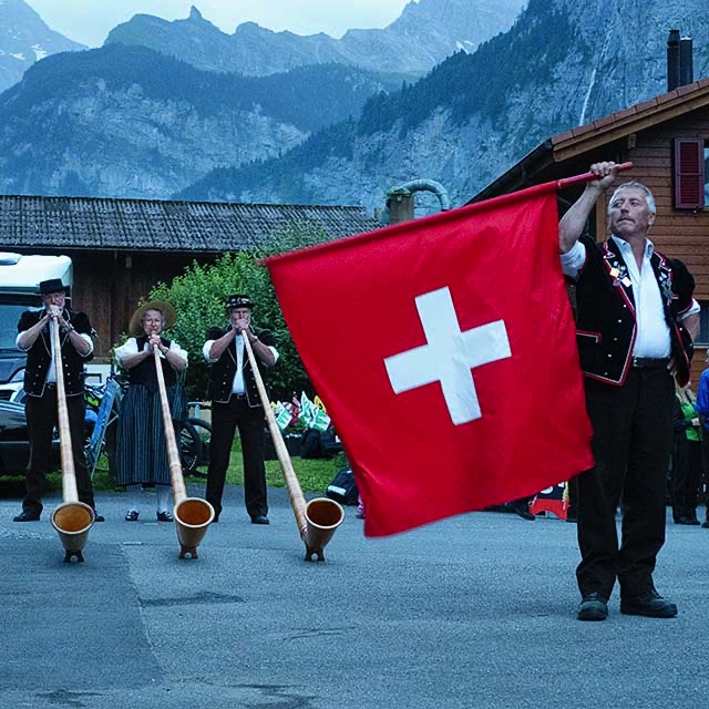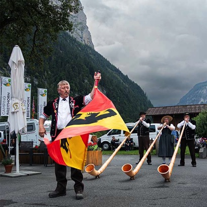 2025-08-01_Stechelberg das Alphorntrio Silberhorn, begleitet von einem Fahnenschwinger, wirkt an der Feier für den Nationalfeiertag von Stechelberg Tourismus mit.