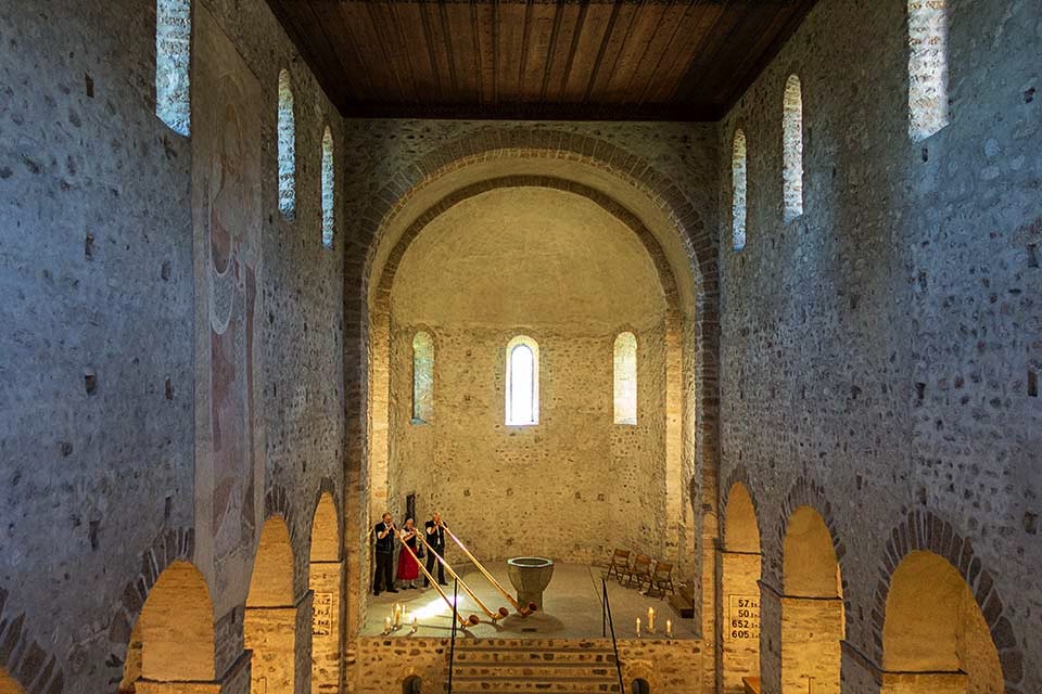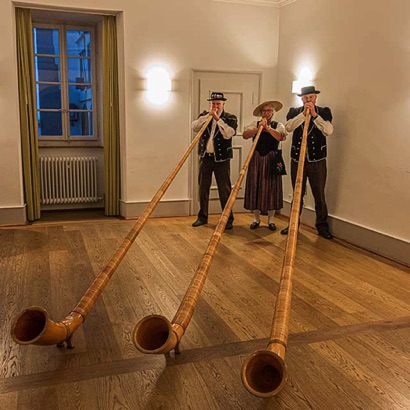 2022-10-14_Koeniz das Alphorntrio Silberhorn eröffnet den Apéro zum 40 jährigen Jubiläum der GurtenClassic im Rittersaal des Schloss Köniz.