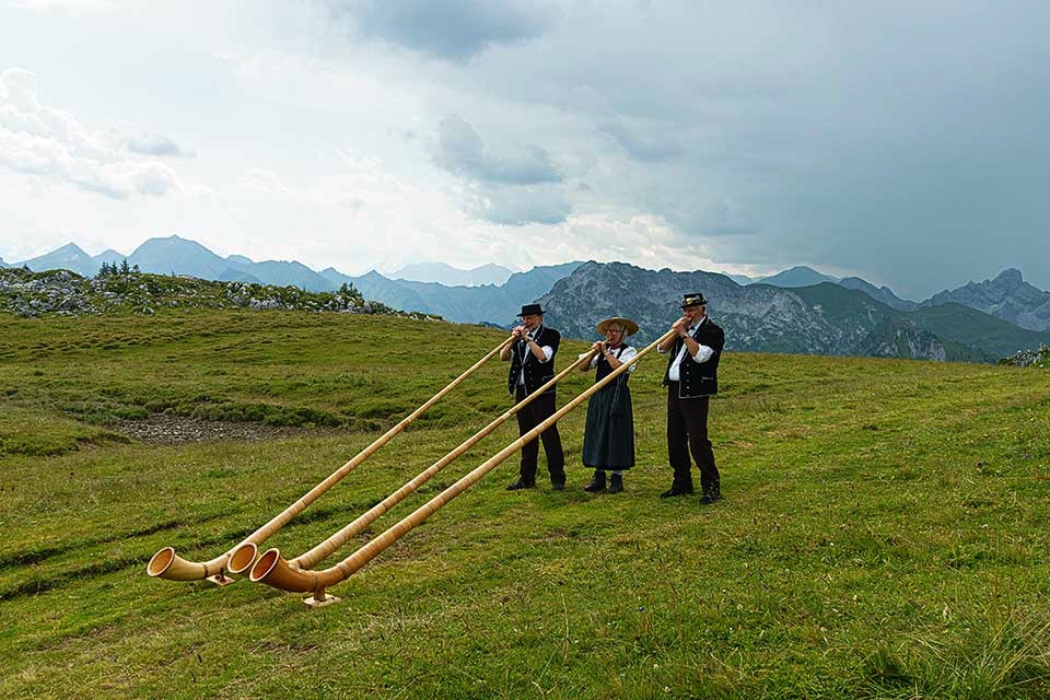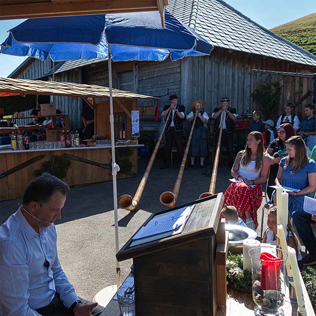 2023-08-20_Oberwirtneren beim Berggottesdienst mit Taufen, spielt das Alphorntrio Silberhorn traditionelle Melodien.