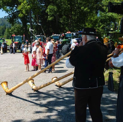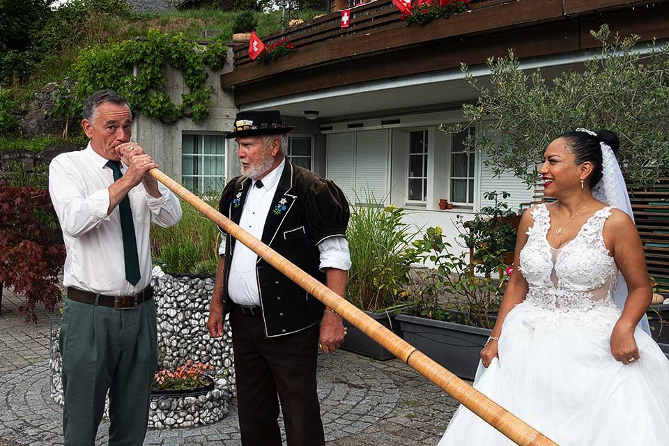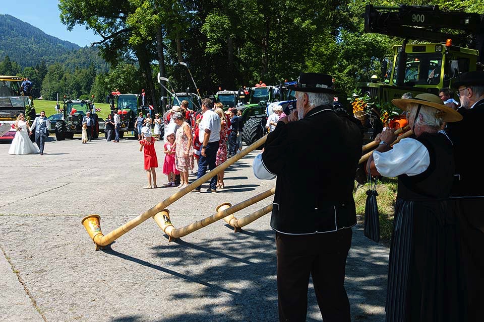 2021-07-24_Blausee auch der Bräutigam kann auf dem Alphorn mehrere Töne spielen. Dies zur grossen Freude der Gäste.