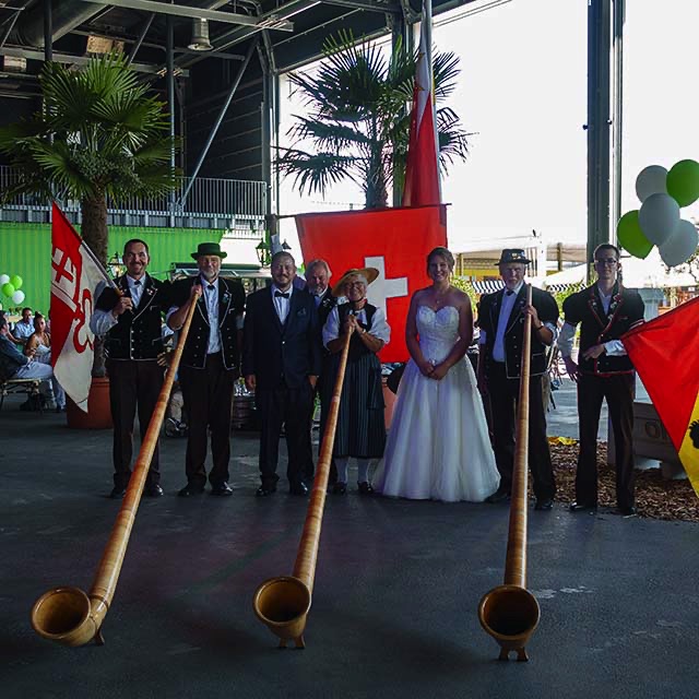 2020-08-08_Thun Hochzeit von D. und R., die Melodien des Alphorntrio Silberhorn werden von den Fahnenschwingern begleitet.