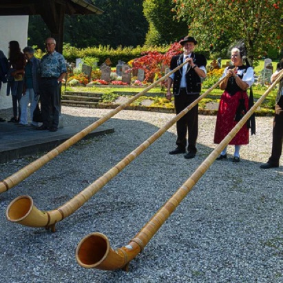 2025-09-16_Eggiwil für Mennoniten aus Nordamerika trägt das Alphorntrio Silberhorn traditionelle Melodien vor.