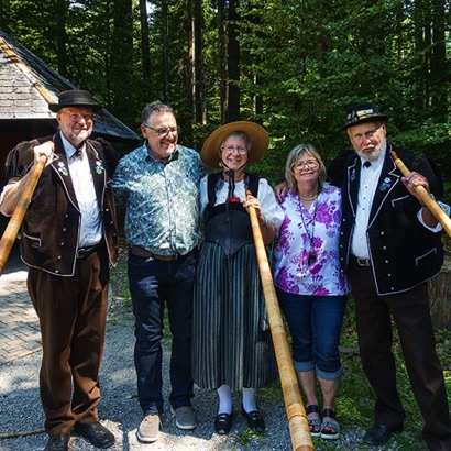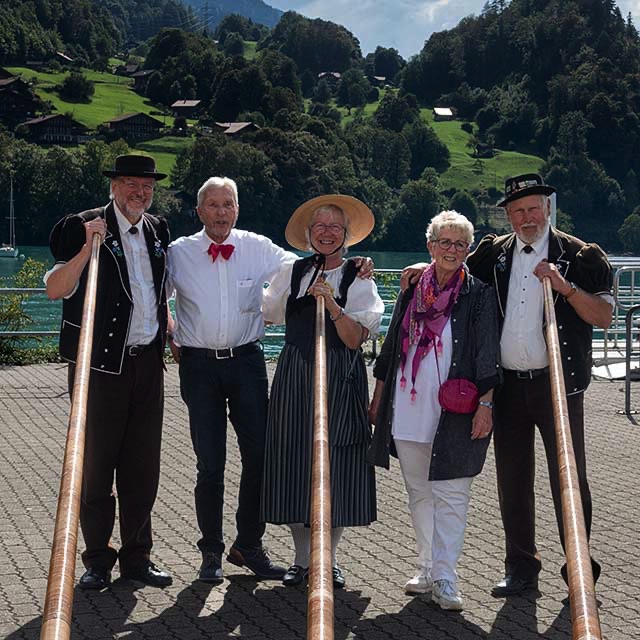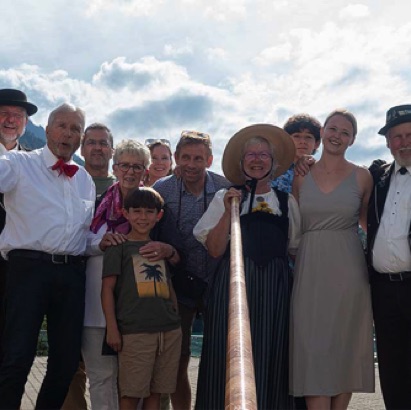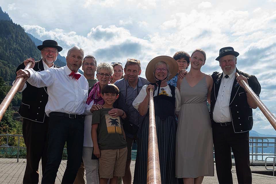 2023-09-02_Iseltwald die beiden Geburtstagskinder und die Familienangehörigen mit dem Alphorntrio Silberhorn.