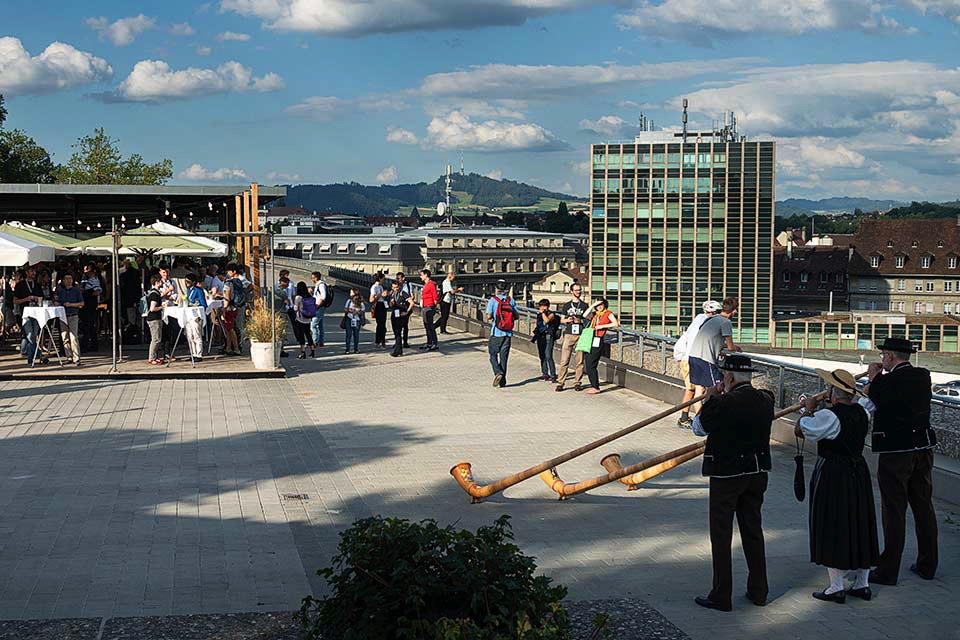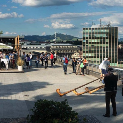 2022-07-05_Bern Apero einer Wissenschaftler-Konferenz begleitet von Melodien des Alphorntrio Silberhorn.