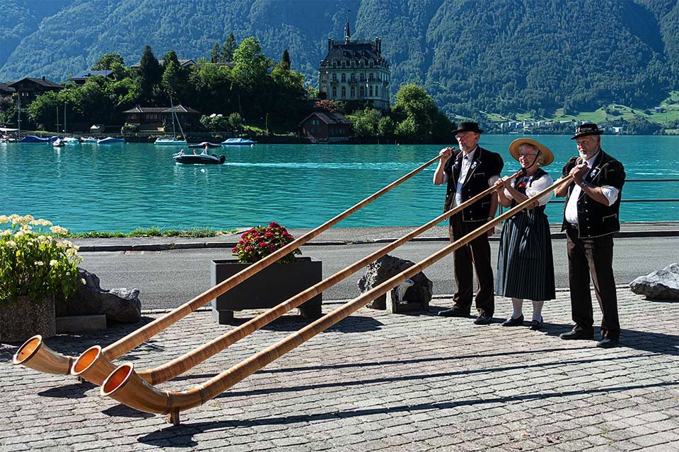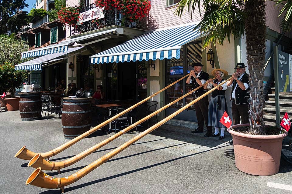 2025-08-01_Spiez bei schönem Wetter spielt das Alphorntrio Silberhorn für die Gäste des Hotel Belvedere am Nationalfeiertag feierliche Alphornmelodien.