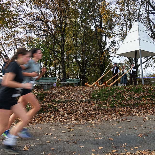 2022-10-30_GurtenClassic auch zahlreiche Läufer werden vom Alphorntrio Silberhorn für den Schlussspurt angefeuert.