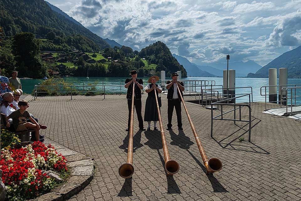 2023-09-02_Iseltwald an der Schiffländte empfängt das Alphorntrio Silberhorn die Festgesellschaft zur Geburtstagsfeier.