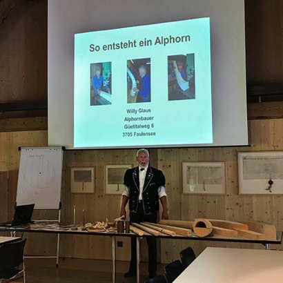 2019-03-07_Krattigen beim Spielen der Eröffnungsmelodien anlässlich einer Vorführung Alphornbau im Hotel Sunnehüsi.